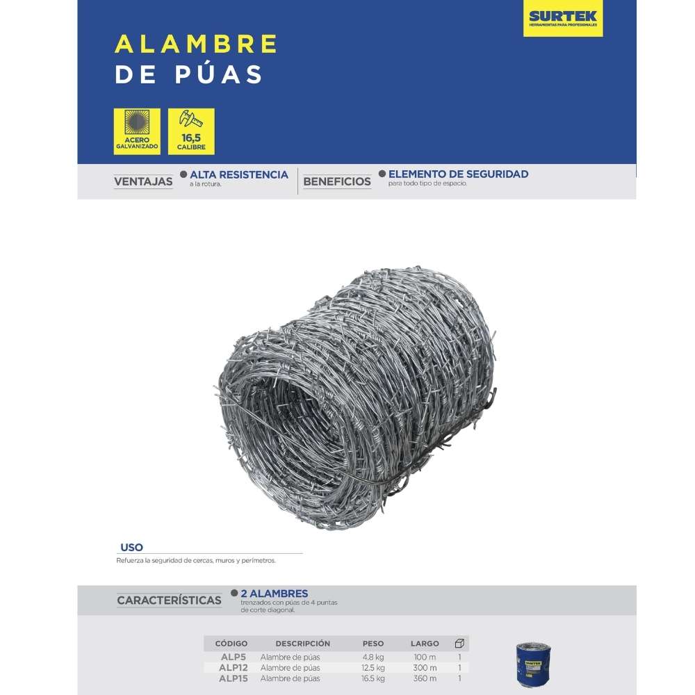 Alambre de púas calibre 16.5, 100 m, 4.8 kg Surtek