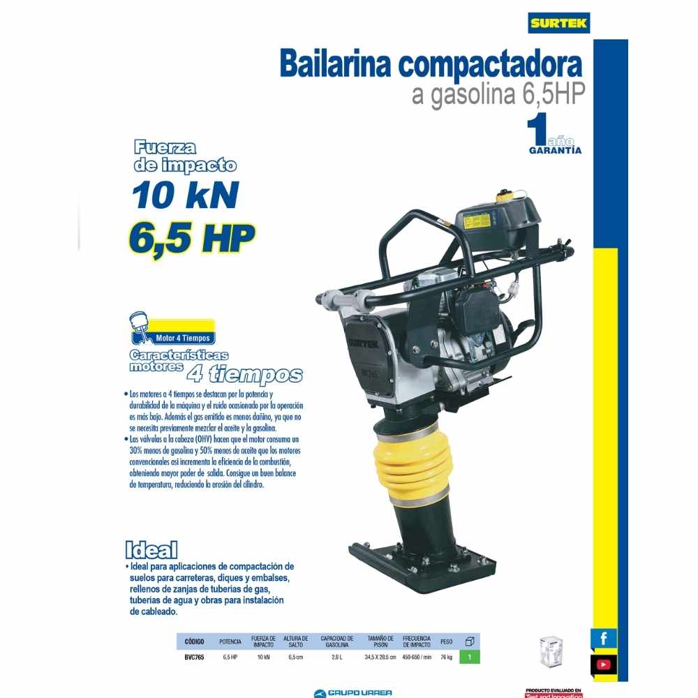 Bailarina compactadora a gasolina con motor de 4 tiempos 6.5 HP Surtek