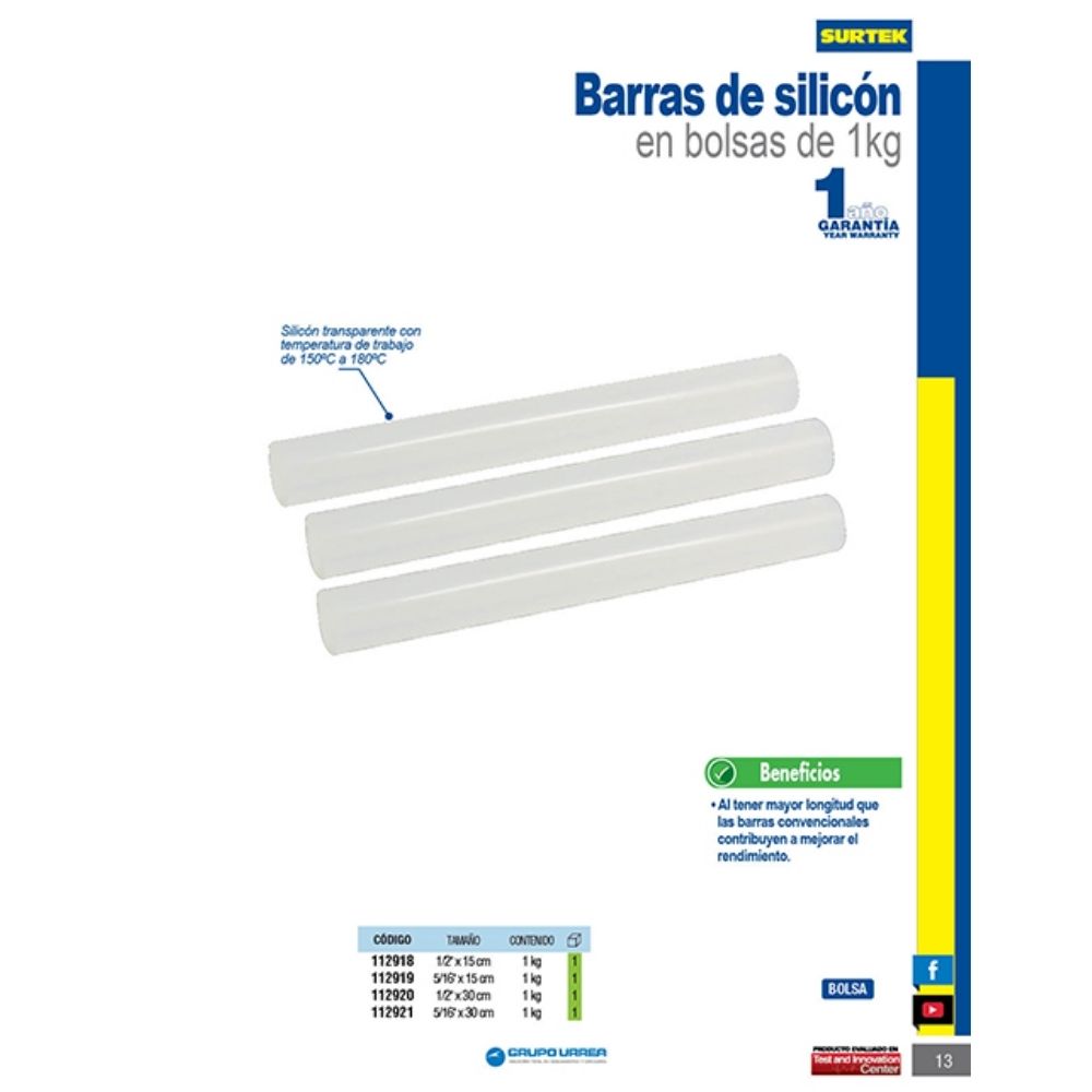 Barra de silicón 1/2″ x 15 cm, 1 kg en bolsa Surtek