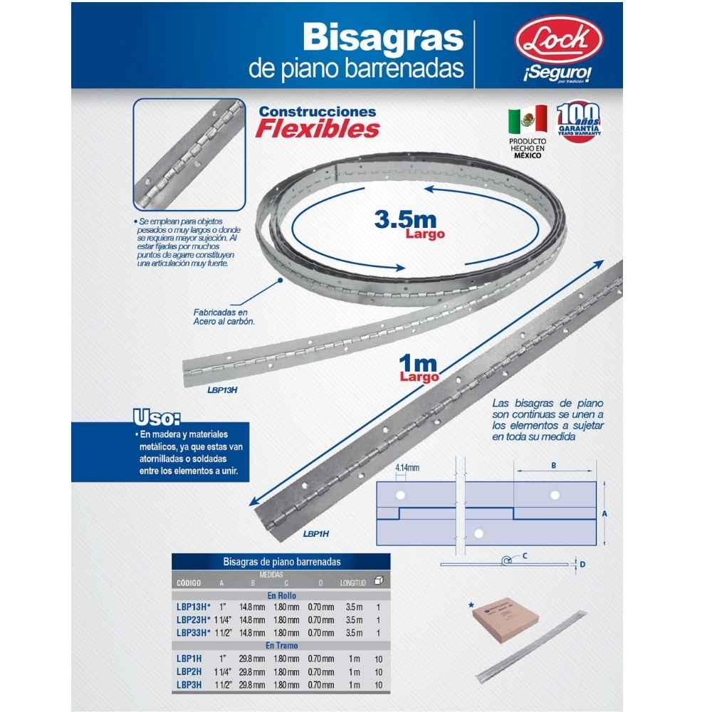 Bisagra piano barrenadas 1-1/2″ x 3.5 m, natural, en caja Lock