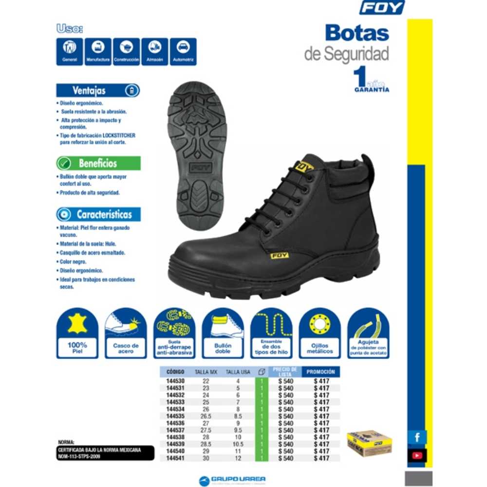 Botas de seguridad collarín doble con casquillo de acero #26 cm Foy