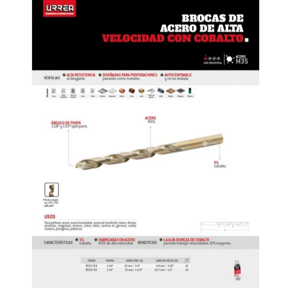 Broca con cobalto de acero de alta velocidad 1/64″ zanco recto Urrea