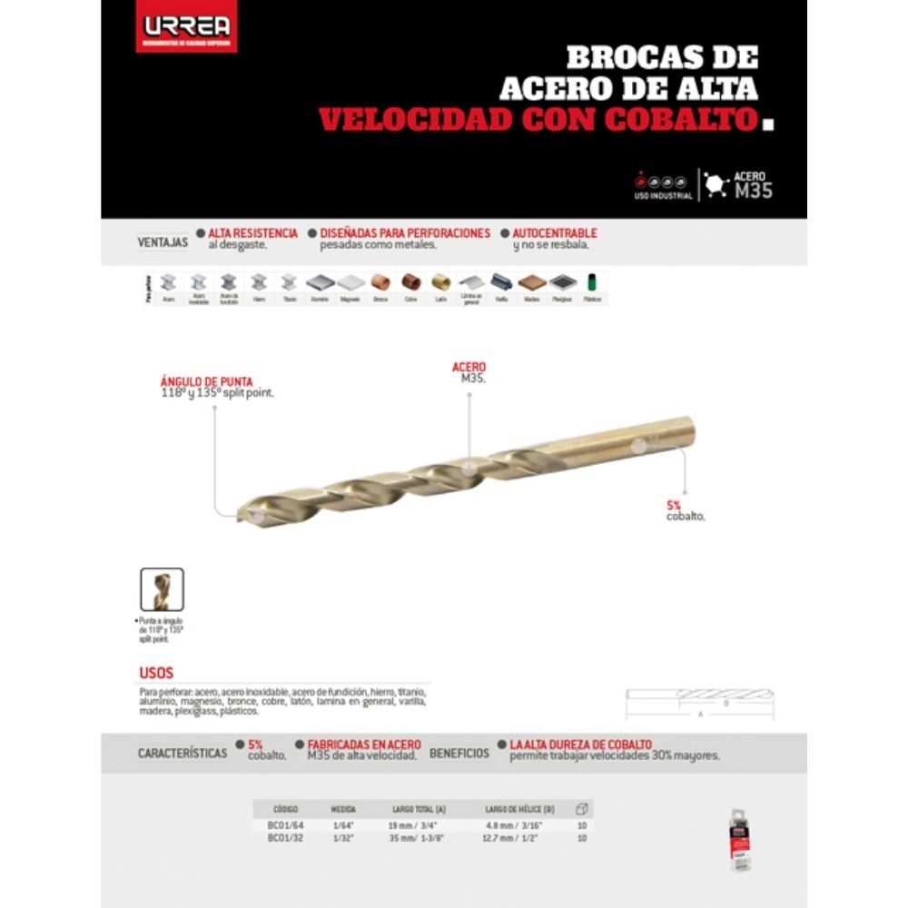 Broca con cobalto de acero de alta velocidad zanco recto 1/16″ Urrea