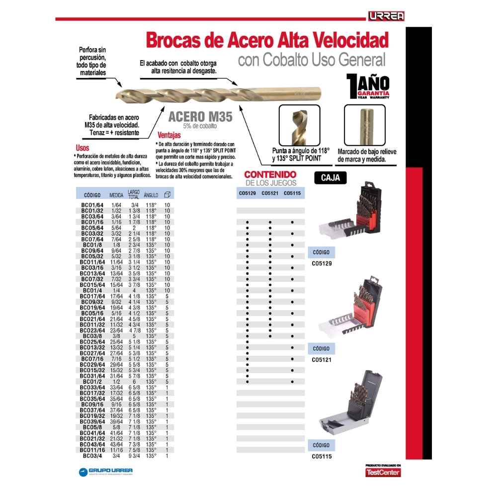 Broca con cobalto de acero de alta velocidad zanco recto 1/8″ Urrea