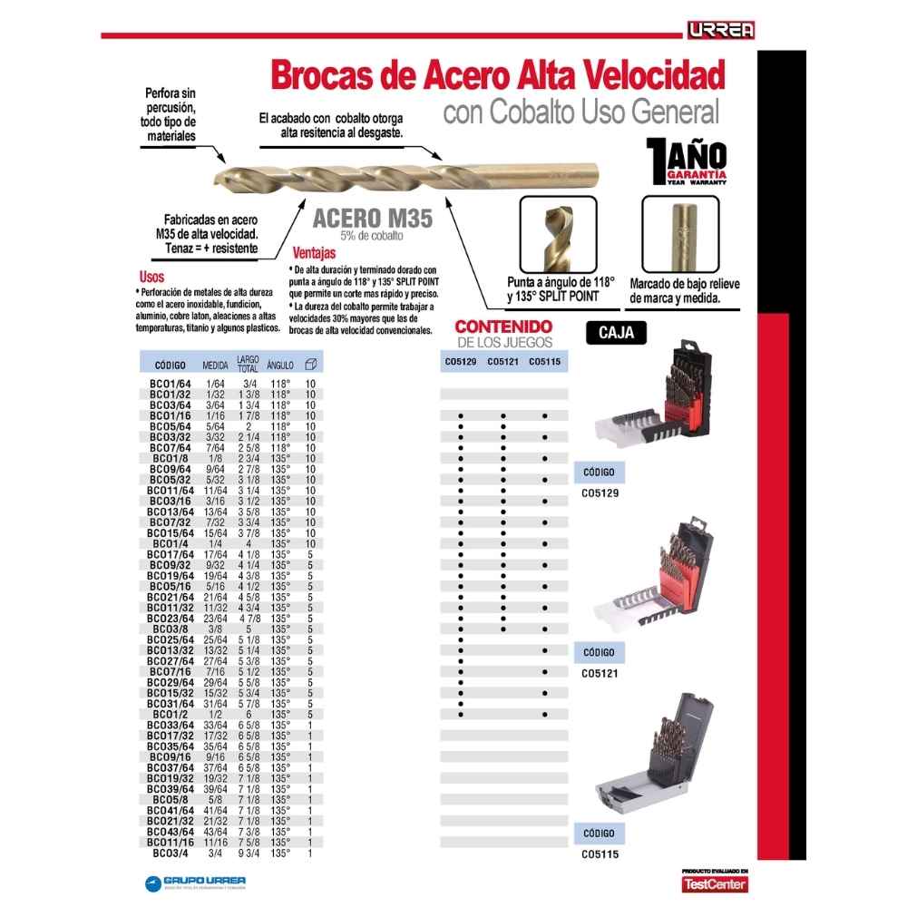 Broca con cobalto de acero de alta velocidad zanco recto 3/16″ Urrea