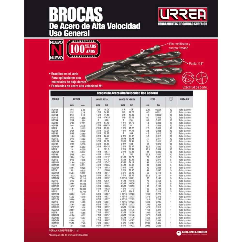 Broca negra de acero de alta velocidad zanco recto 1/64″ Urrea