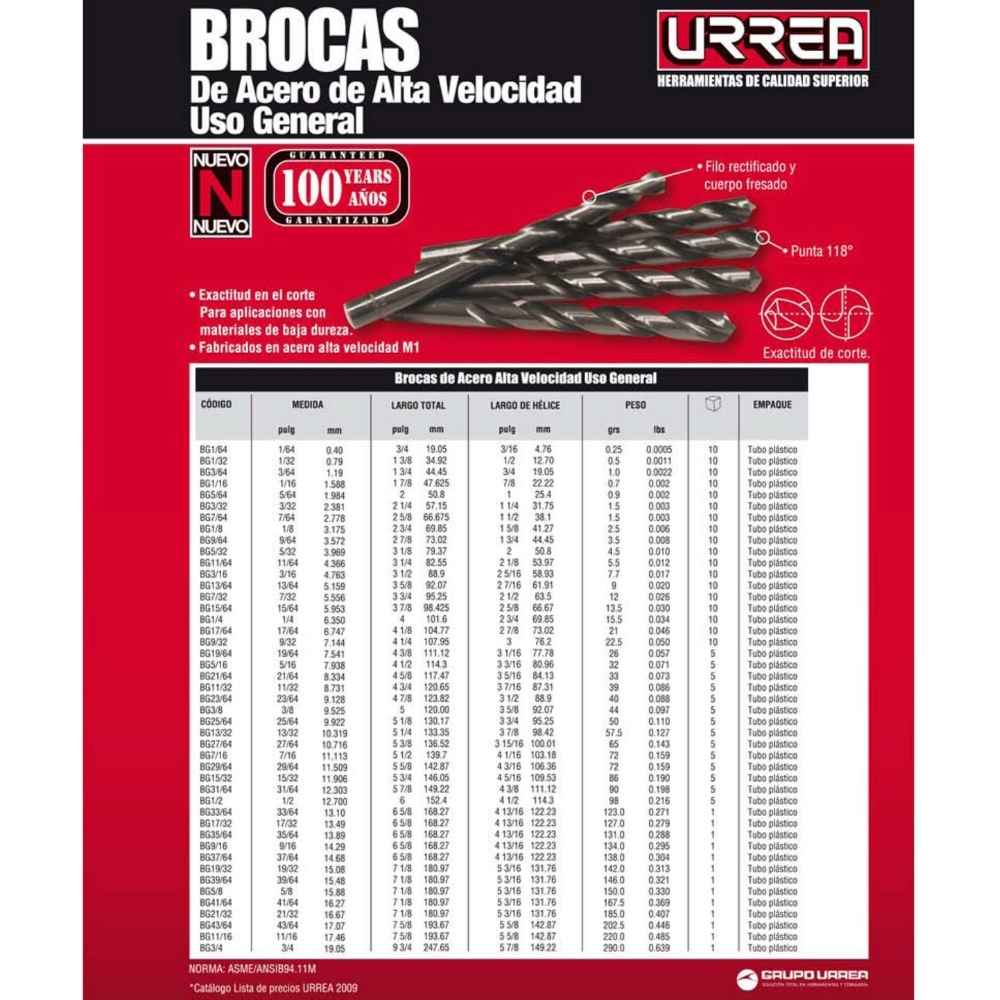 Broca negra de acero de alta velocidad zanco recto 1/32″ Urrea