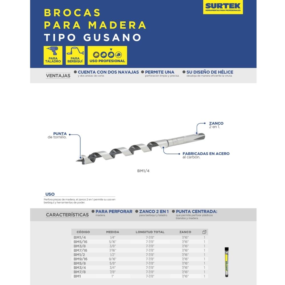 Broca para madera de acero al carbono tipo gusano 5/8″ zanco 2 en 1 Surtek