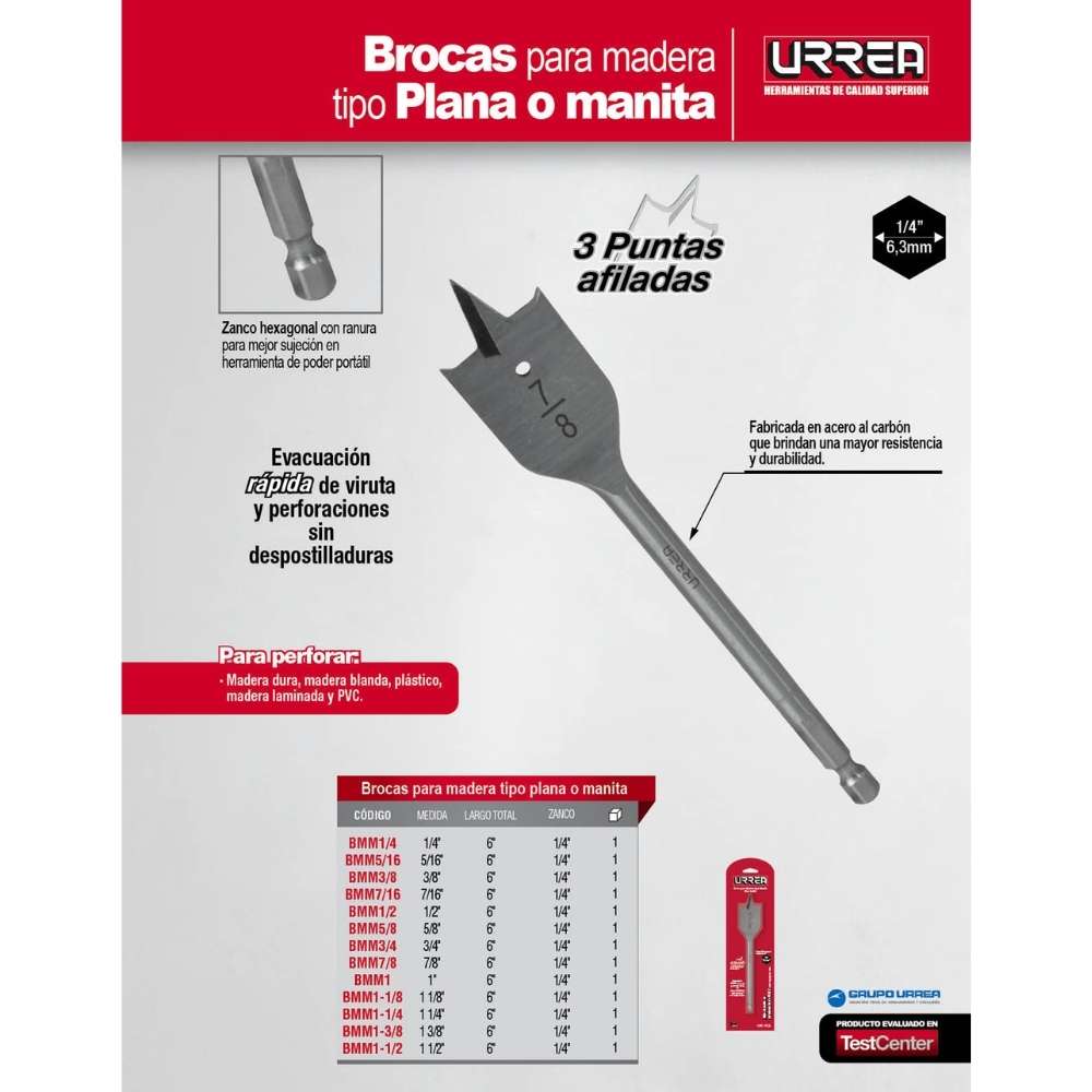 Broca para madera de acero al carbono tipo manita 5/16″ zanco de 1/4″ Urrea