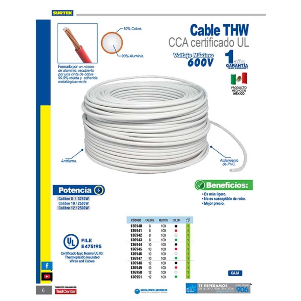 -Cable THW de CCA (Copper Clad aluminum). 90% aluminio, 10% cobre.