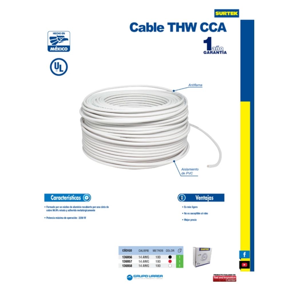 Cable eléctrico THW calibre 14, 100 m color blanco Surtek