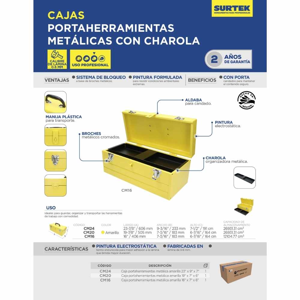 Caja portaherramientas metálica color amarillo con charola 23″ x 9″ x 7″ Surtek