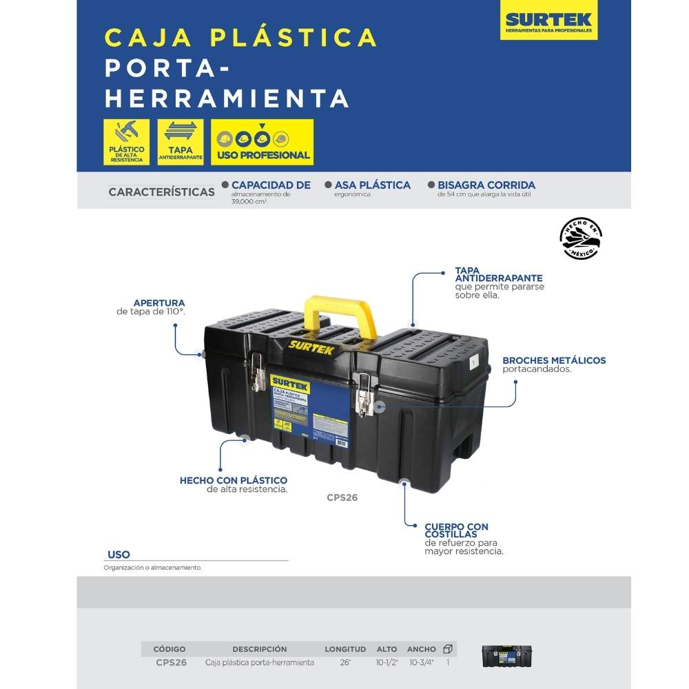 Caja portaherramientas plástica con broches metálicos color negro 26″ x 10″ x 10″ Surtek