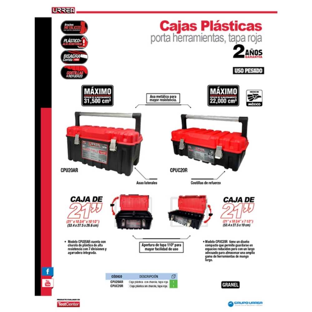 Caja portaherramientas plástica con broches metálicos color negro tapa roja 21″ x 11″ x 10 Urrea