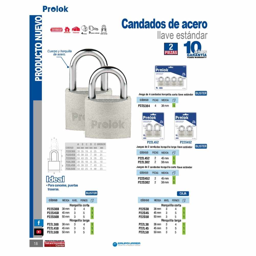 Candado de acero corto 50 mm, llave estándar, en caja Prolok