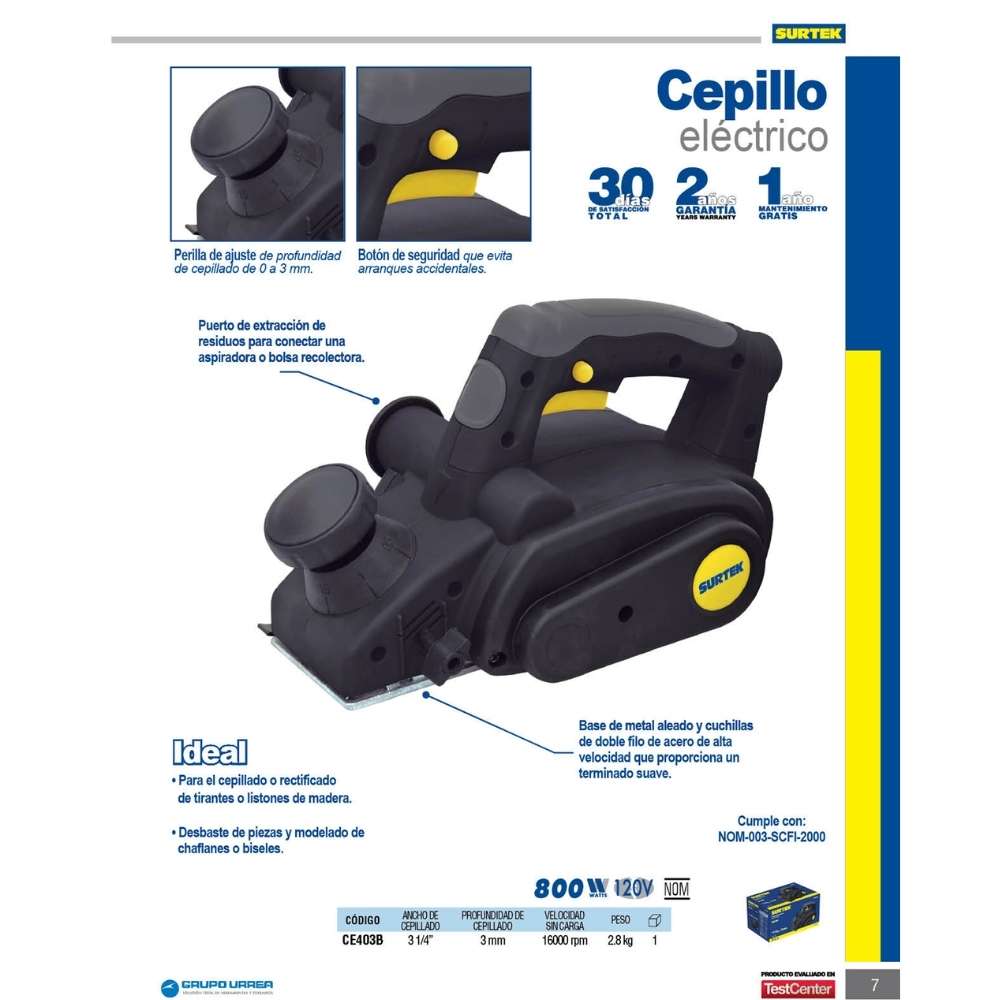 Cepillo eléctrico con perilla de ajuste de profundidad de 0 a 3 mm, 3-1/4″, 800 W Surtek