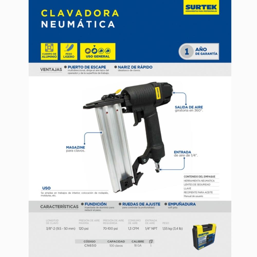 Clavadora neumática calibre 18GA, capacidad 3/8″-2″, 100 clavos Surtek