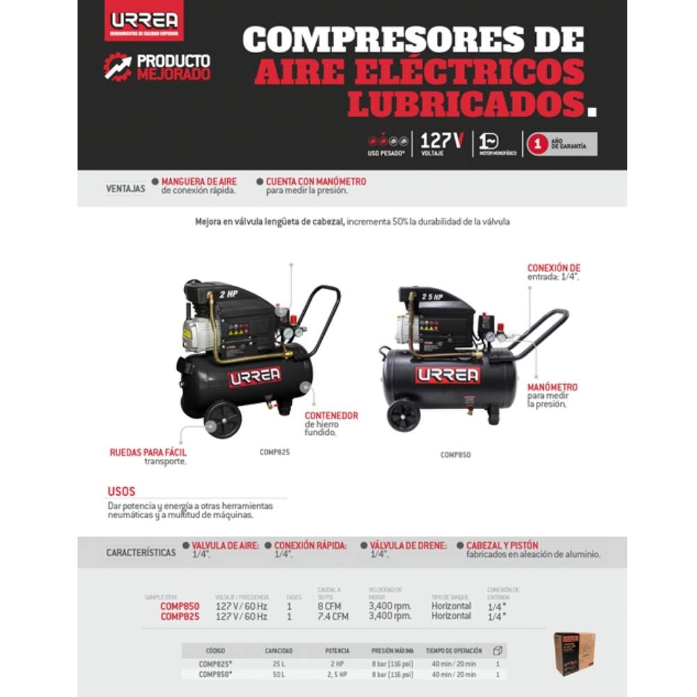 Compresor de aire eléctrico lubricado 25L, 2HP, 127V Urrea