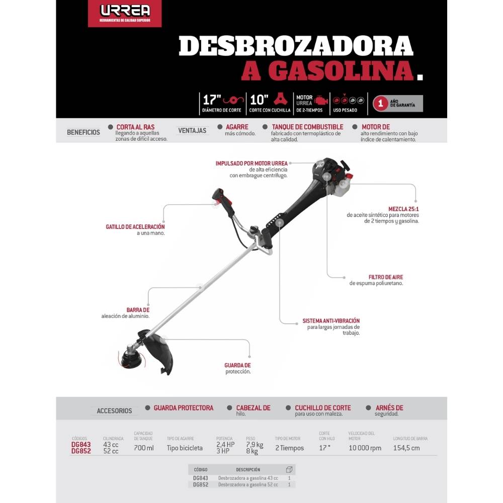 Desbrozadora a gasolina recta 17.0″ 52 cc Urrea