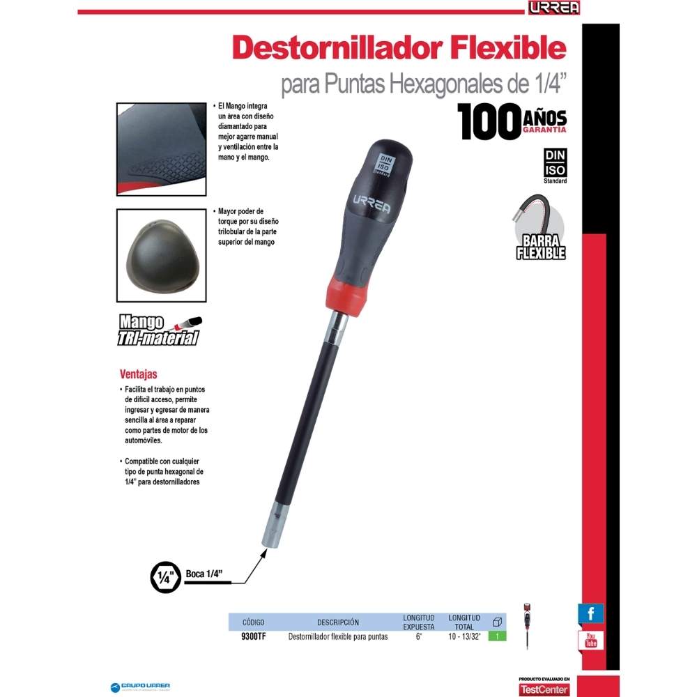 Destornillador flexible magnético con mango trimaterial para puntas 1/4″ Urrea