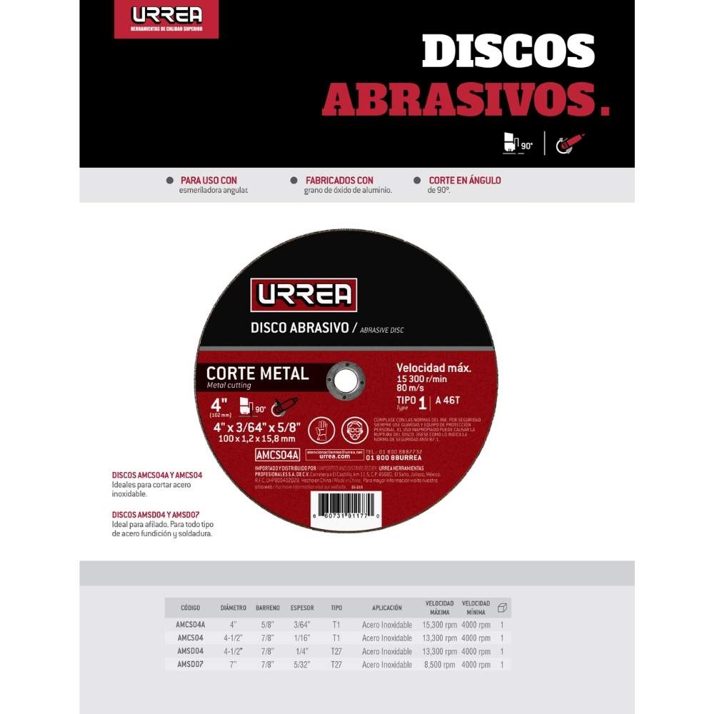 Disco abrasivo tipo 1 para metal 4″ x 3/64″ Urrea