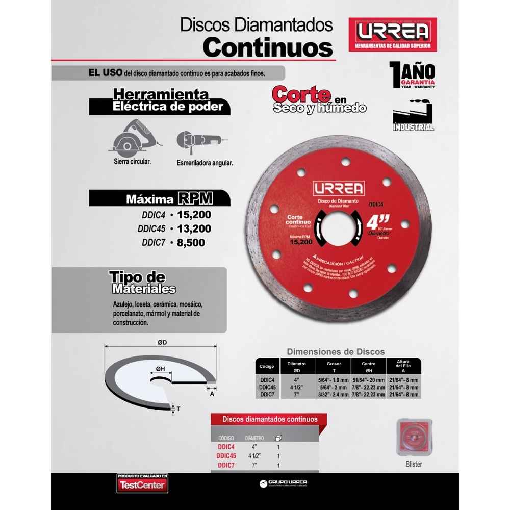 -Disco de diamante uso industrial corte continuo 4″ Urrea