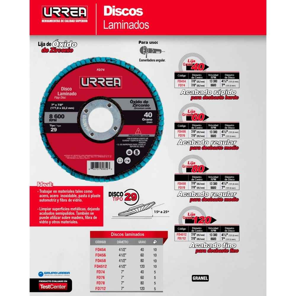 Disco laminado tipo 29 grano 40, 4-1/2″ Urrea