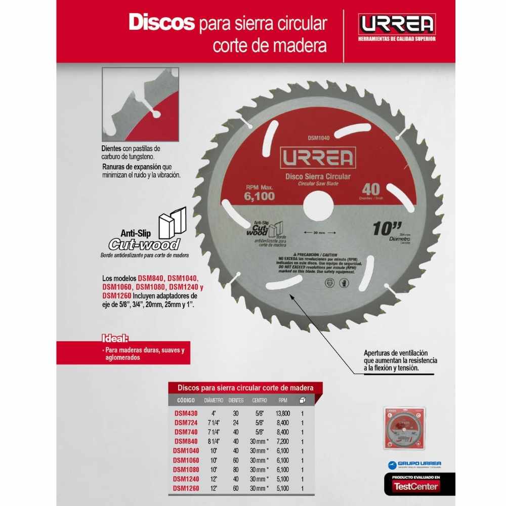 Disco para sierra circular para corte de madera 60 dientes, 10″ Urrea