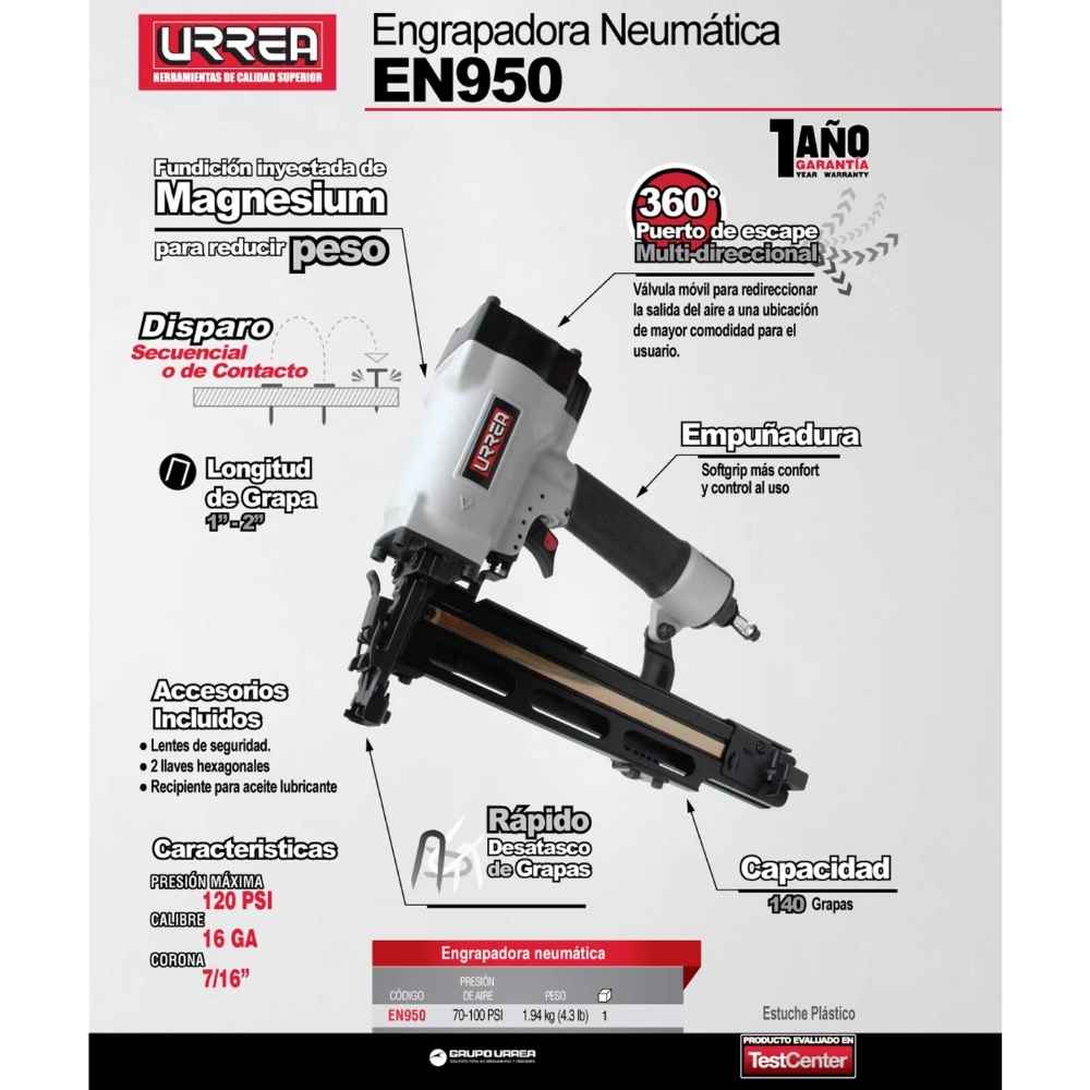 Engrapadora neumática calibre 16, corona 7/16″, capacidad 1″-2″, 100 grapas Urrea