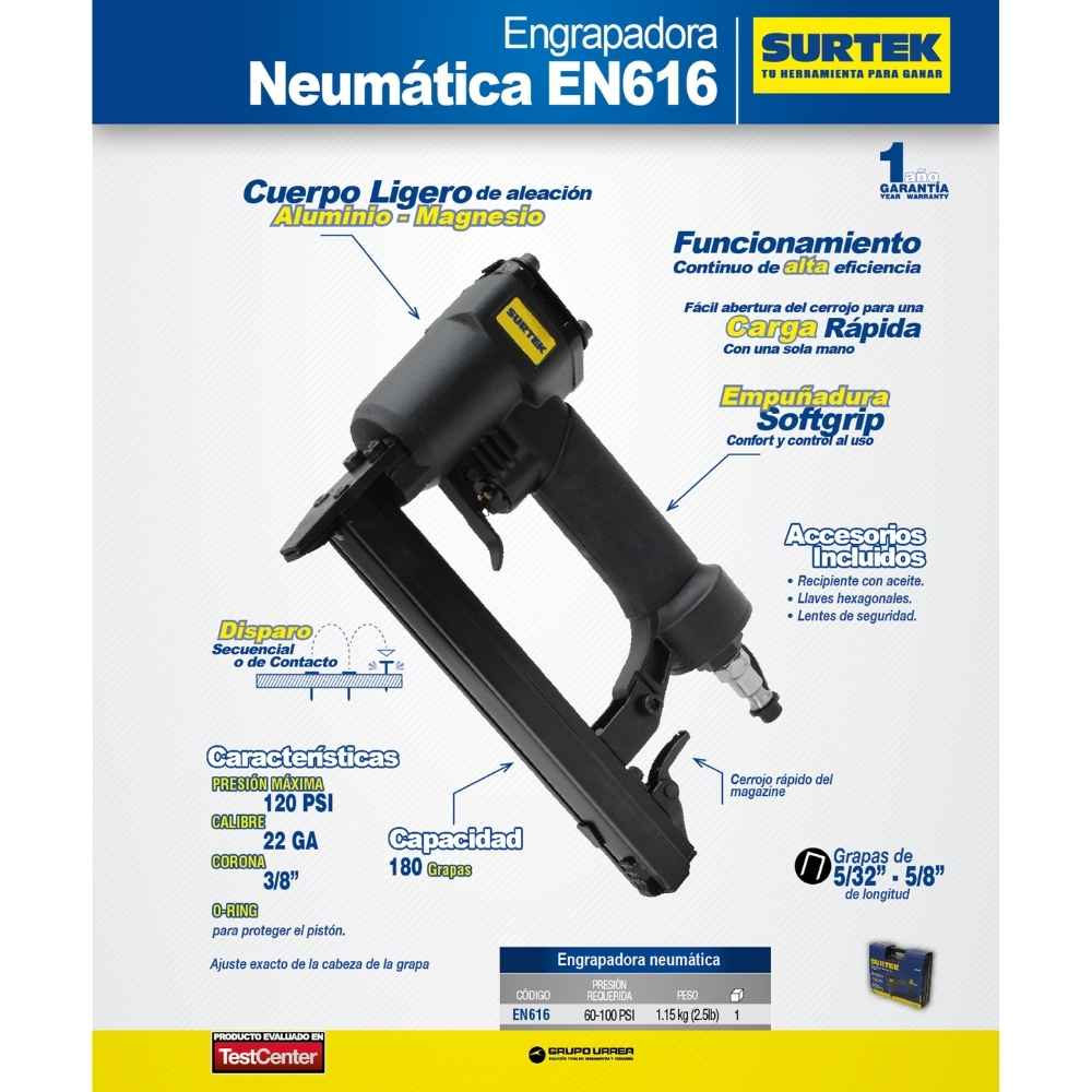 Engrapadora neumática calibre 22GA, corona 3/8 x 5/8″, capacidad 5/32″-5/8″, 180 grapas Surtek
