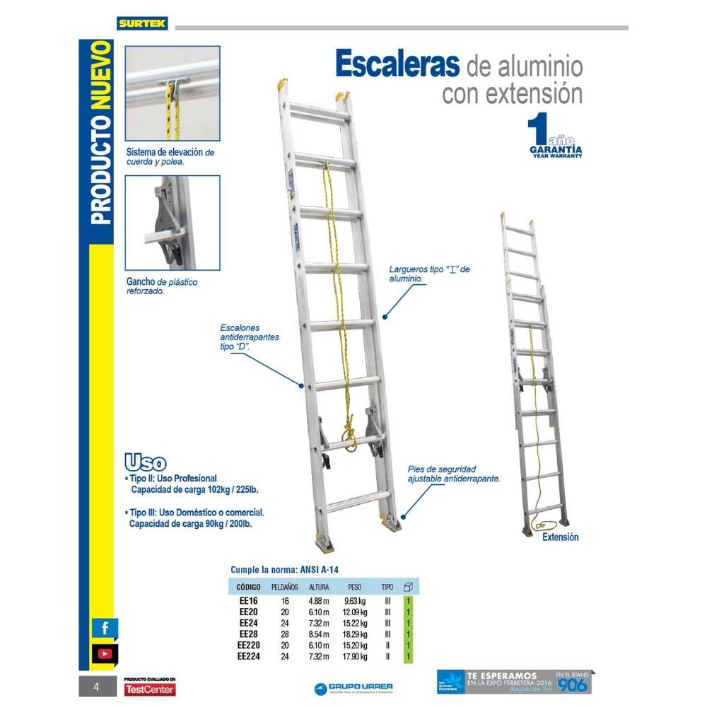 Escalera de extensión tipo III de aluminio con 16 peldaños Surtek