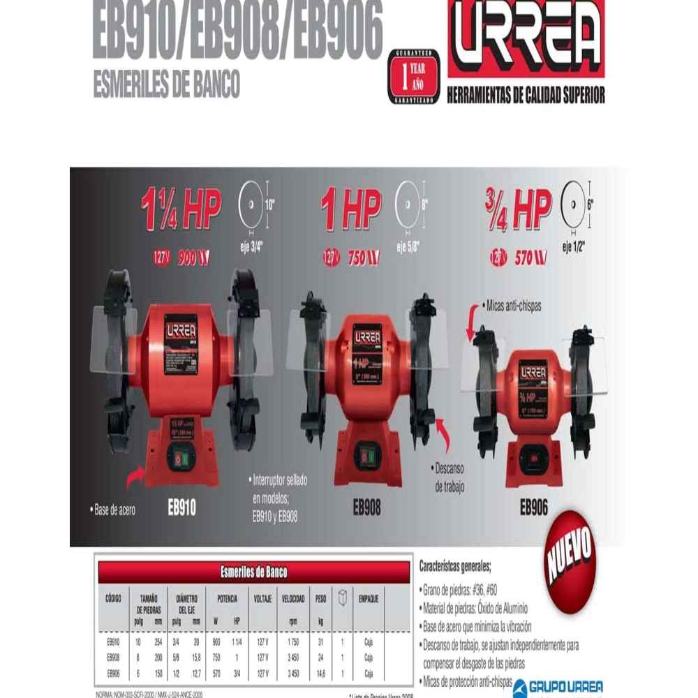 -Esmeril de banco 6″ .75HP 570W 127V 1 fase uso pesado Urrea. -Interruptor sellado.. -Monofásico.. -Capacidad de piedra 6″.
