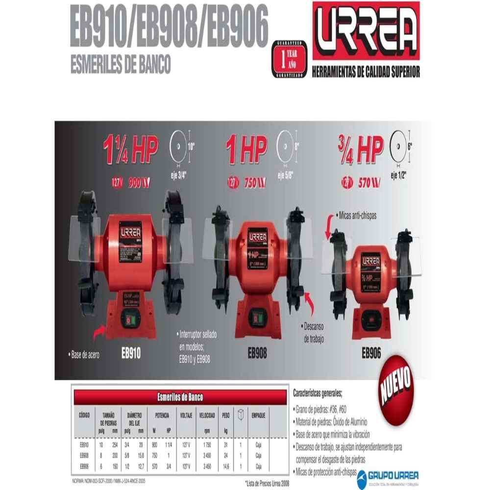 -Esmeril de banco 8″ 1HP 750W 127V 1 fase uso pesado Urrea. -Interruptor sellado.. -Monofásico.. -Capacidad de piedra 8″.