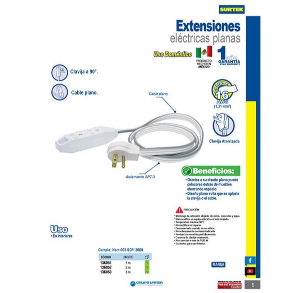 Extensión eléctrica plana aterrizada color blanco, 5 m Surtek