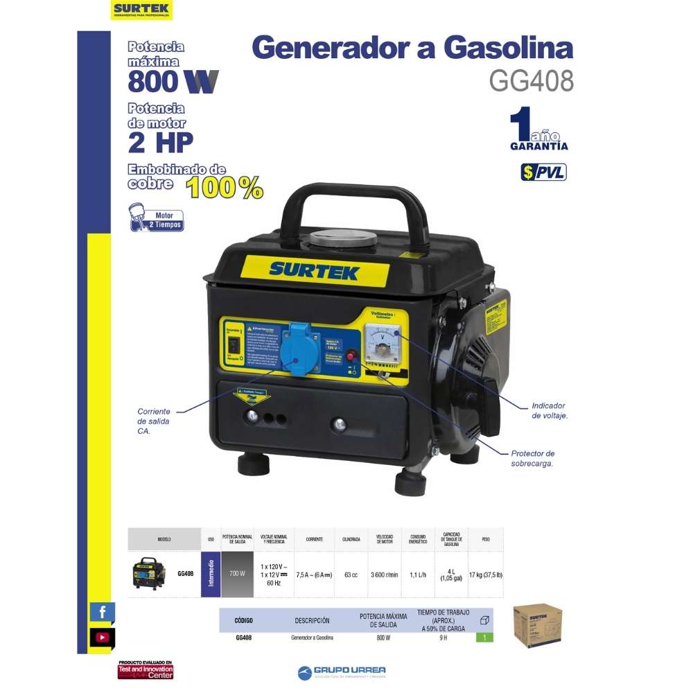 Generador a gasolina 800 W, 63 cc, voltaje de salida 120 V Surtek