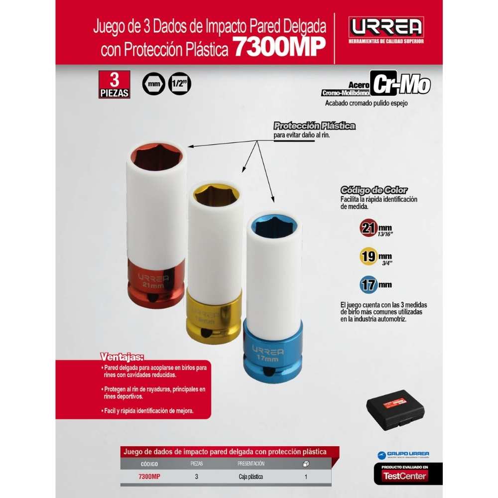 Juego de dados de impacto métricos cuadro de 1/2″ con protección Nylamid, 3 piezas Urrea