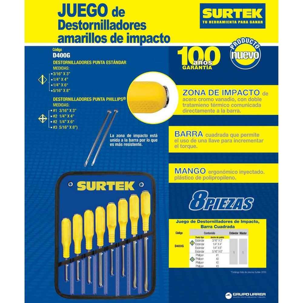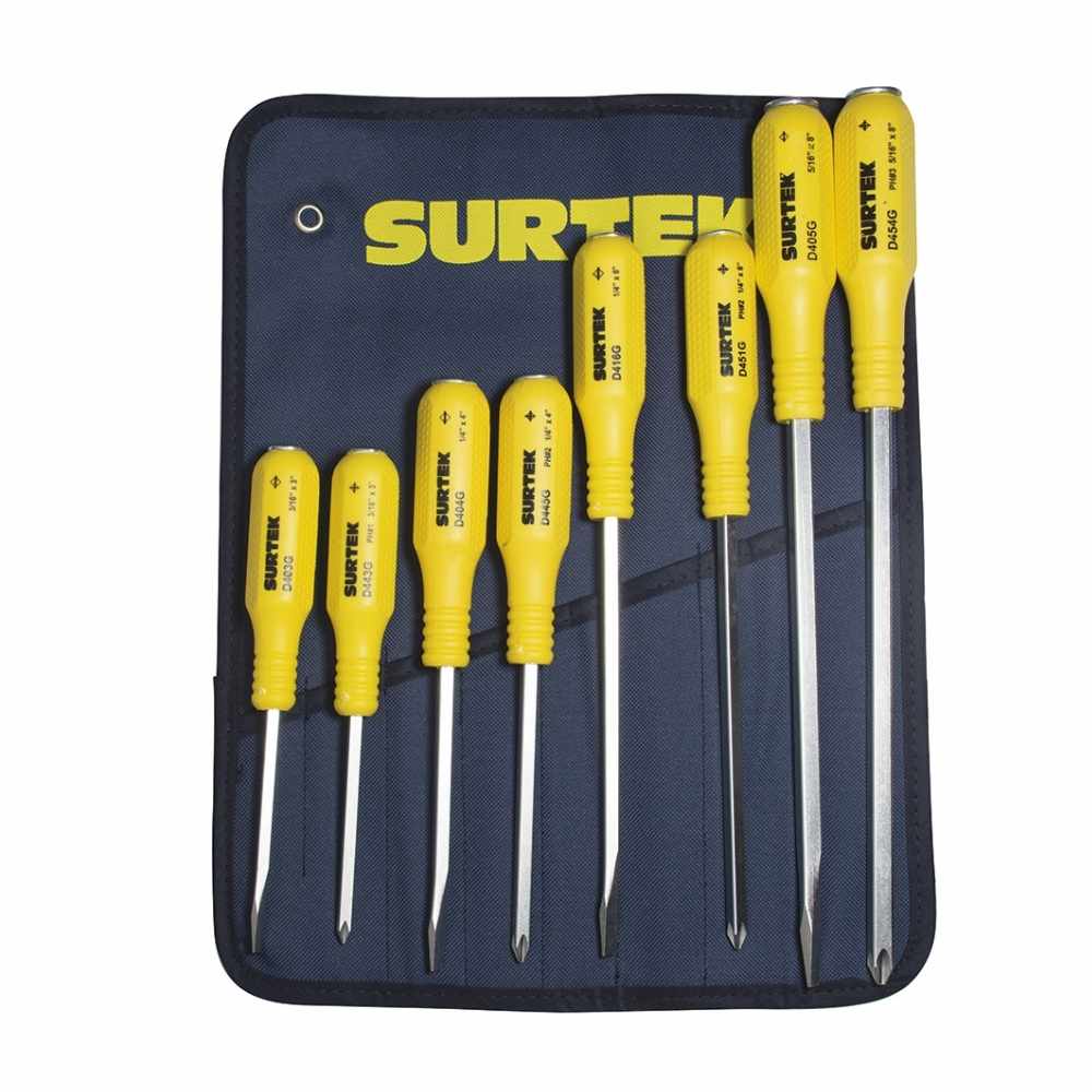 Juego de destornilladores con mango amarillo de golpe combinados, 8 piezas en estuche Surtek