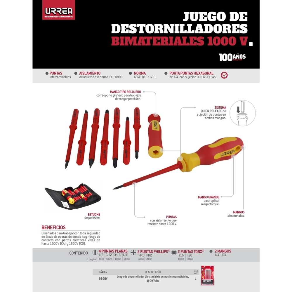 Juego de destornilladores con mango bimaterial y puntas intercambiables 1000 V, 10 piezas Urrea