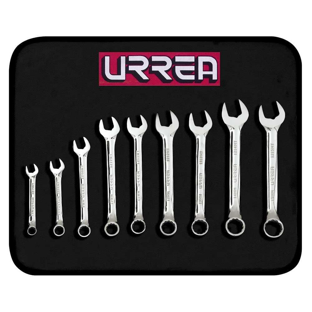 Juego de llaves combinadas cortas pulido espejo métricas, 12 puntas, 9 piezas en estuche Urrea