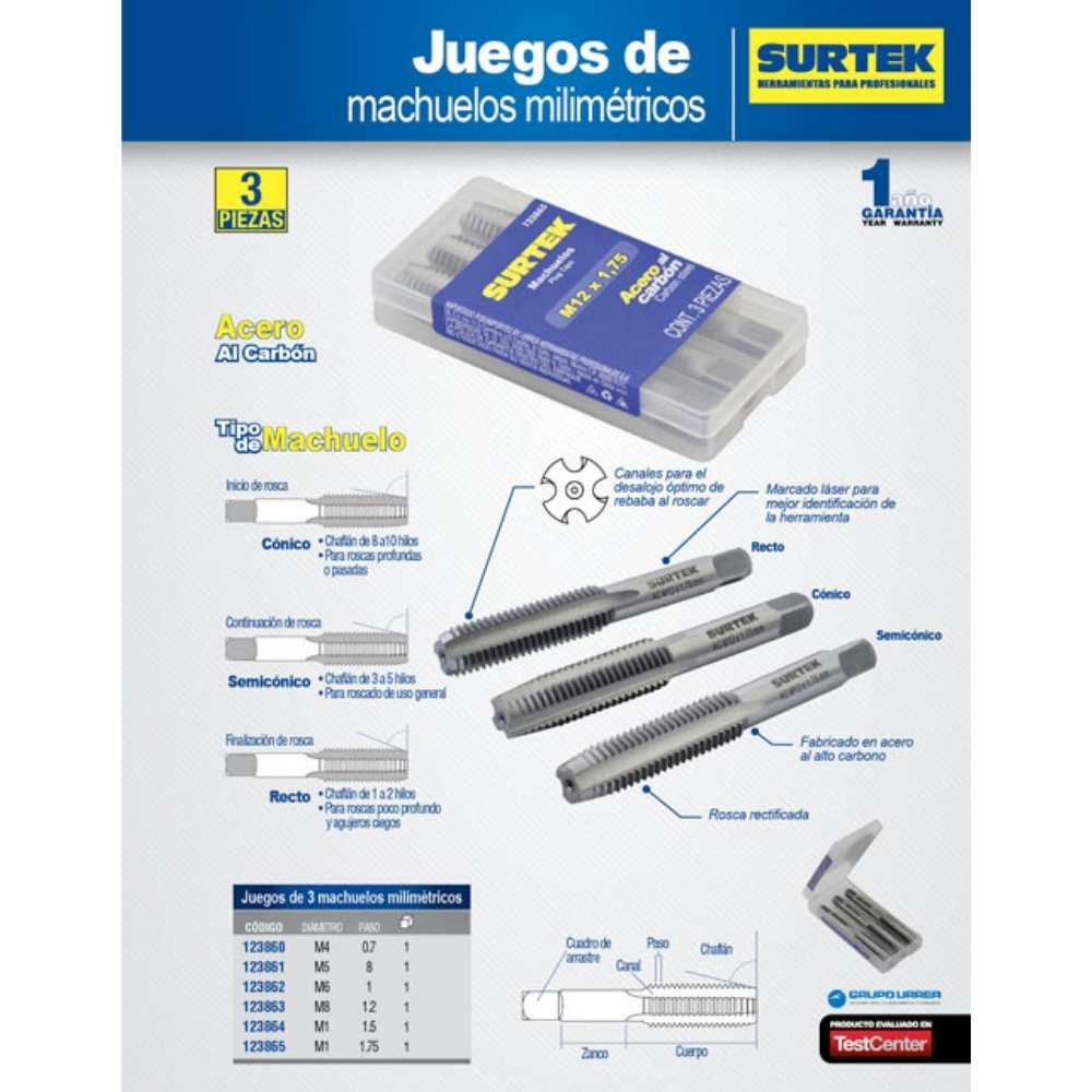 -Juego de 3 machuelos de acero al carbón M6 x 1 Surtek