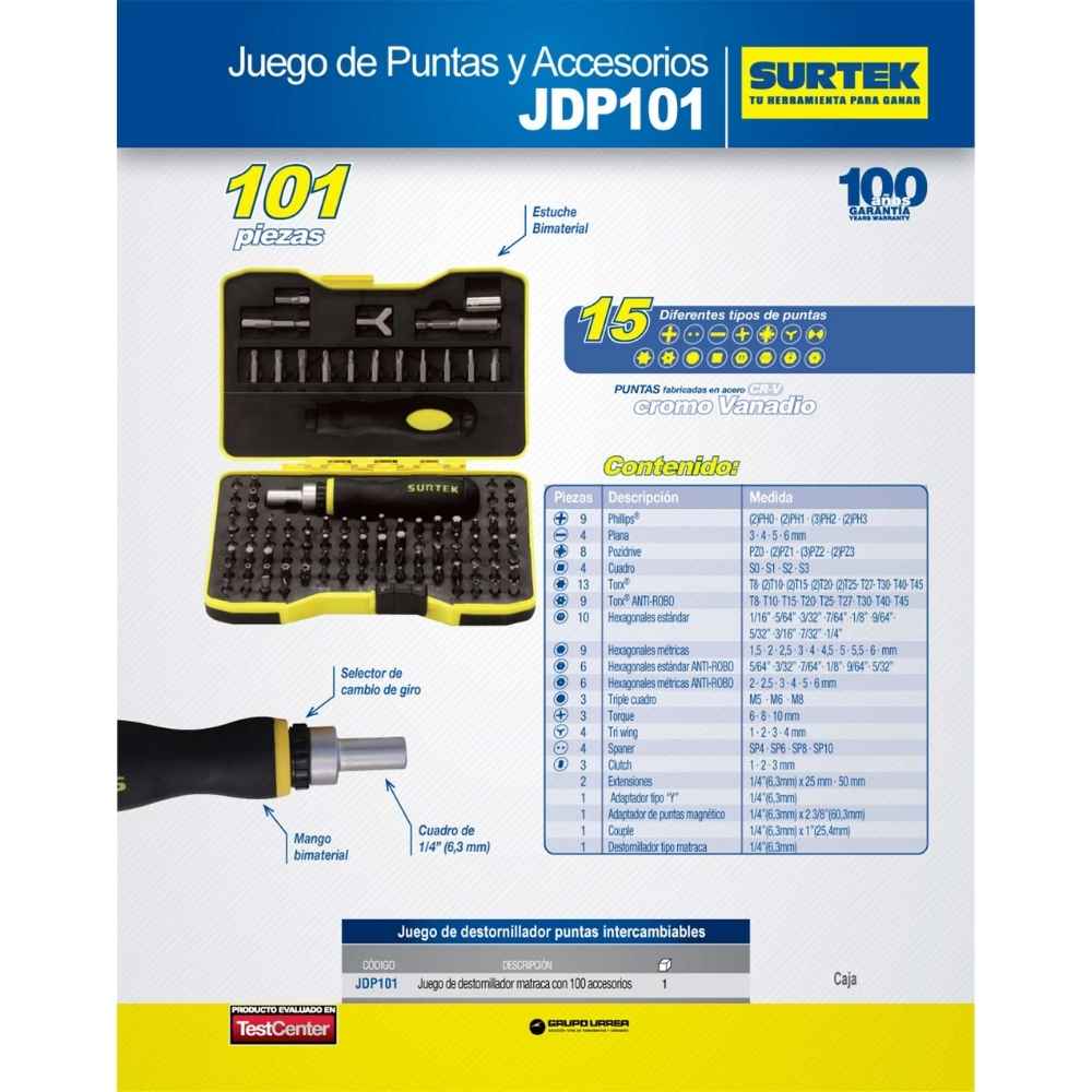 Juego de puntas y accesorios hexágono de 1/4″, 101 piezas en caja plástica Surtek