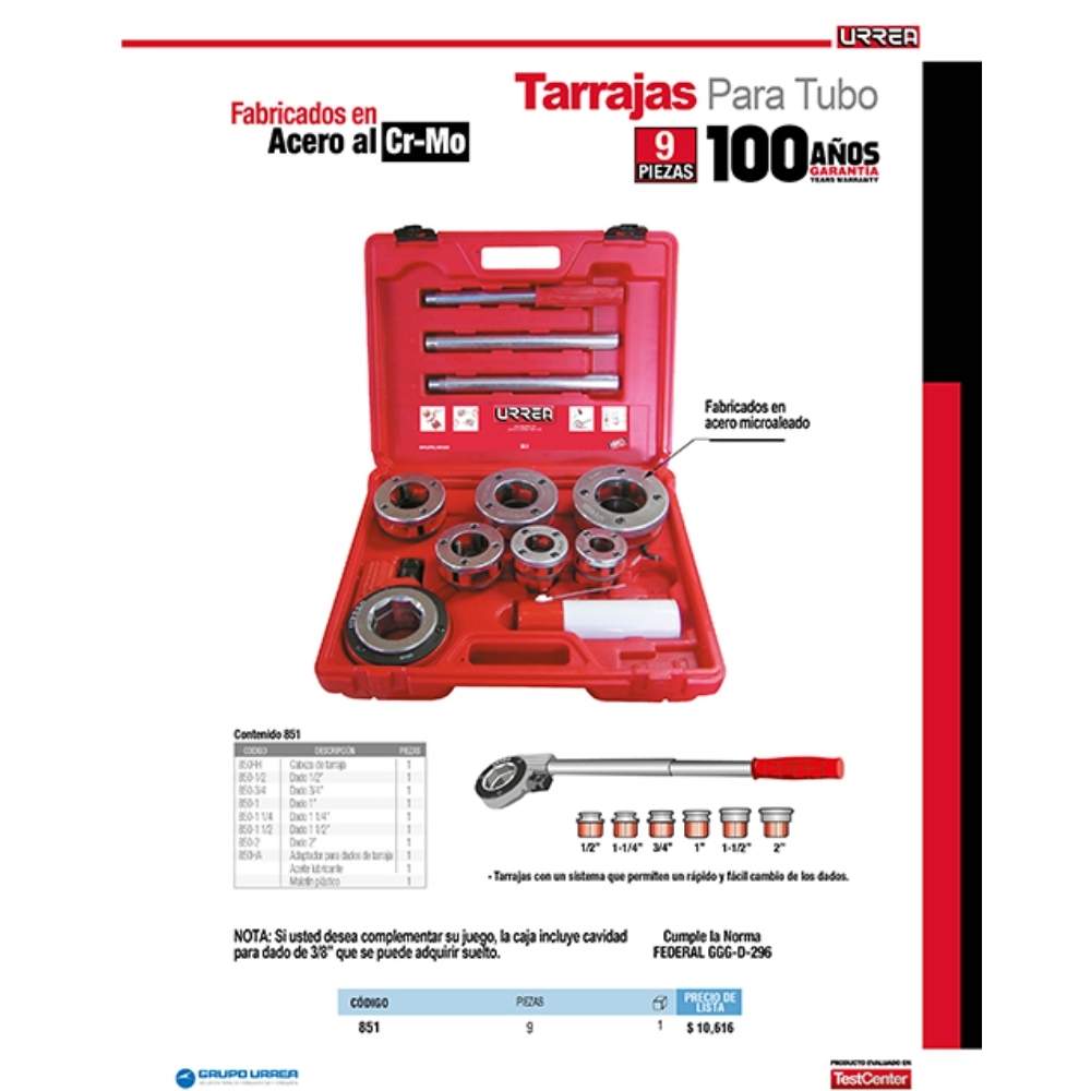Juego de tarraja para tubo de 1/2″ a 2″ NPT, 9 piezas Urrea