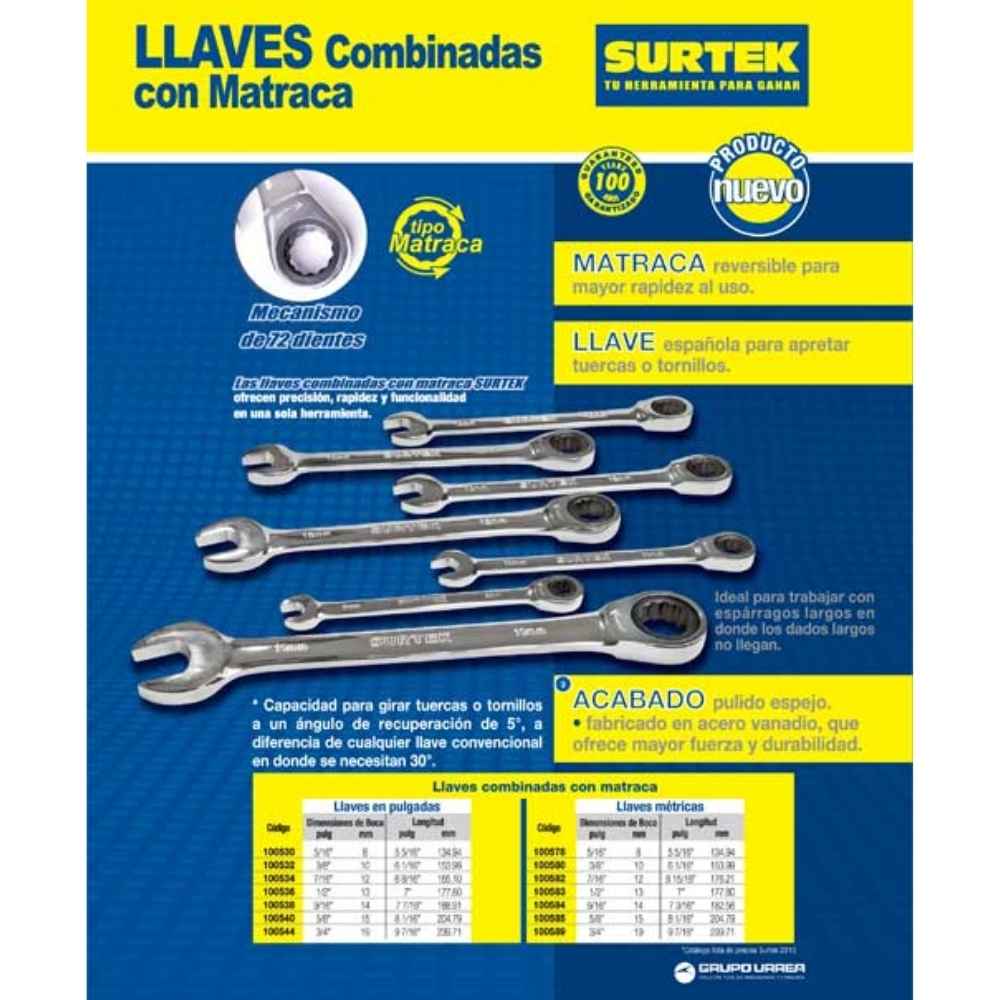 Llave combinada pulido espejo de matraca en pulgadas, 12 puntas, 1/2″ Surtek
