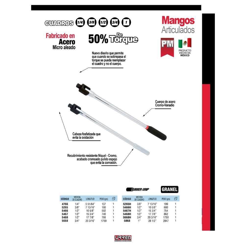 Mango articulado con mango rubber grip para dado cuadro de 1/2″, 17-7/8″ Urrea