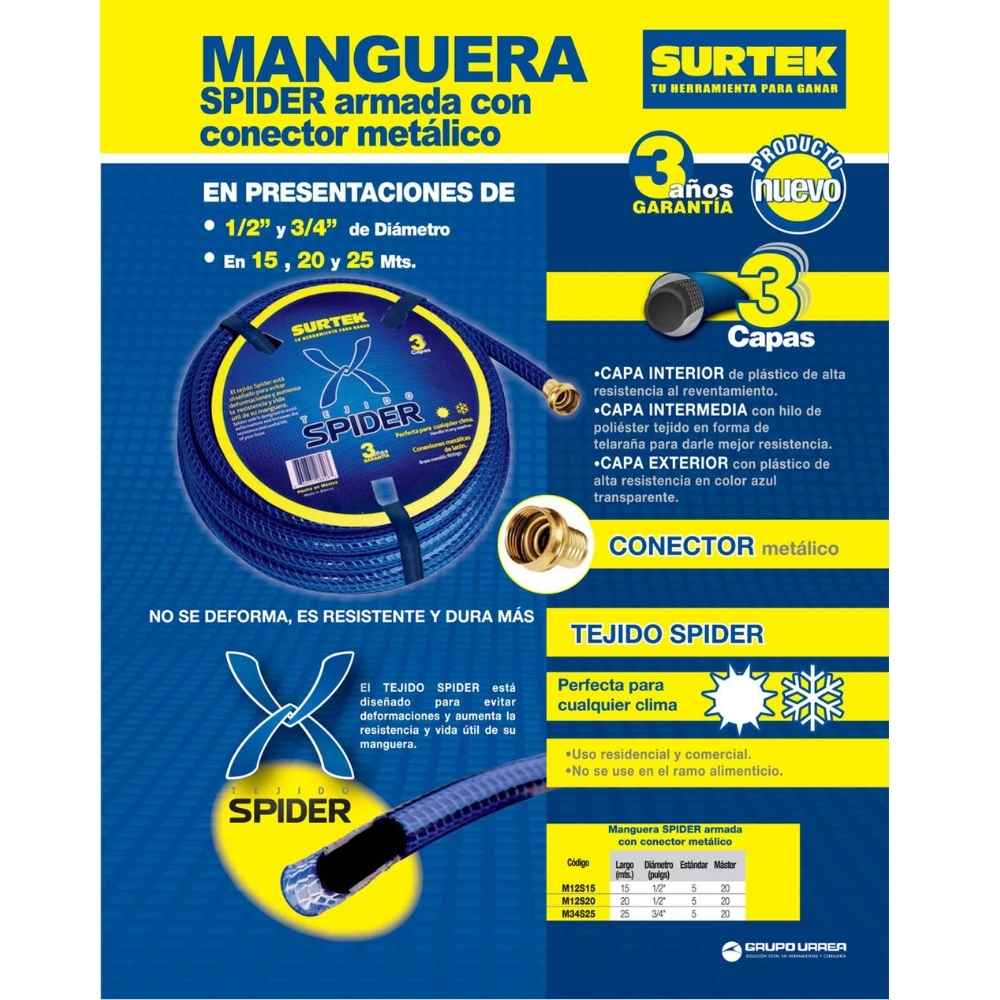 Manguera para jardín tejido spider con conector metálico 3/4″, 25 m Surtek