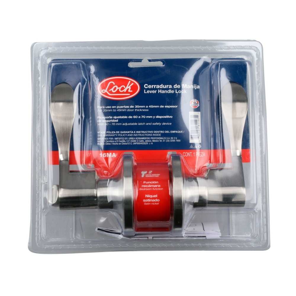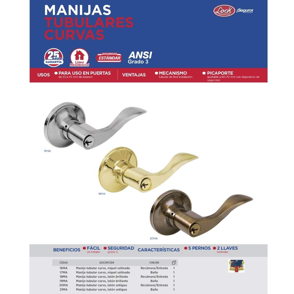 Manija tubular curva función entrada y recámara, níquel satinado, llave estándar, blíster Lock
