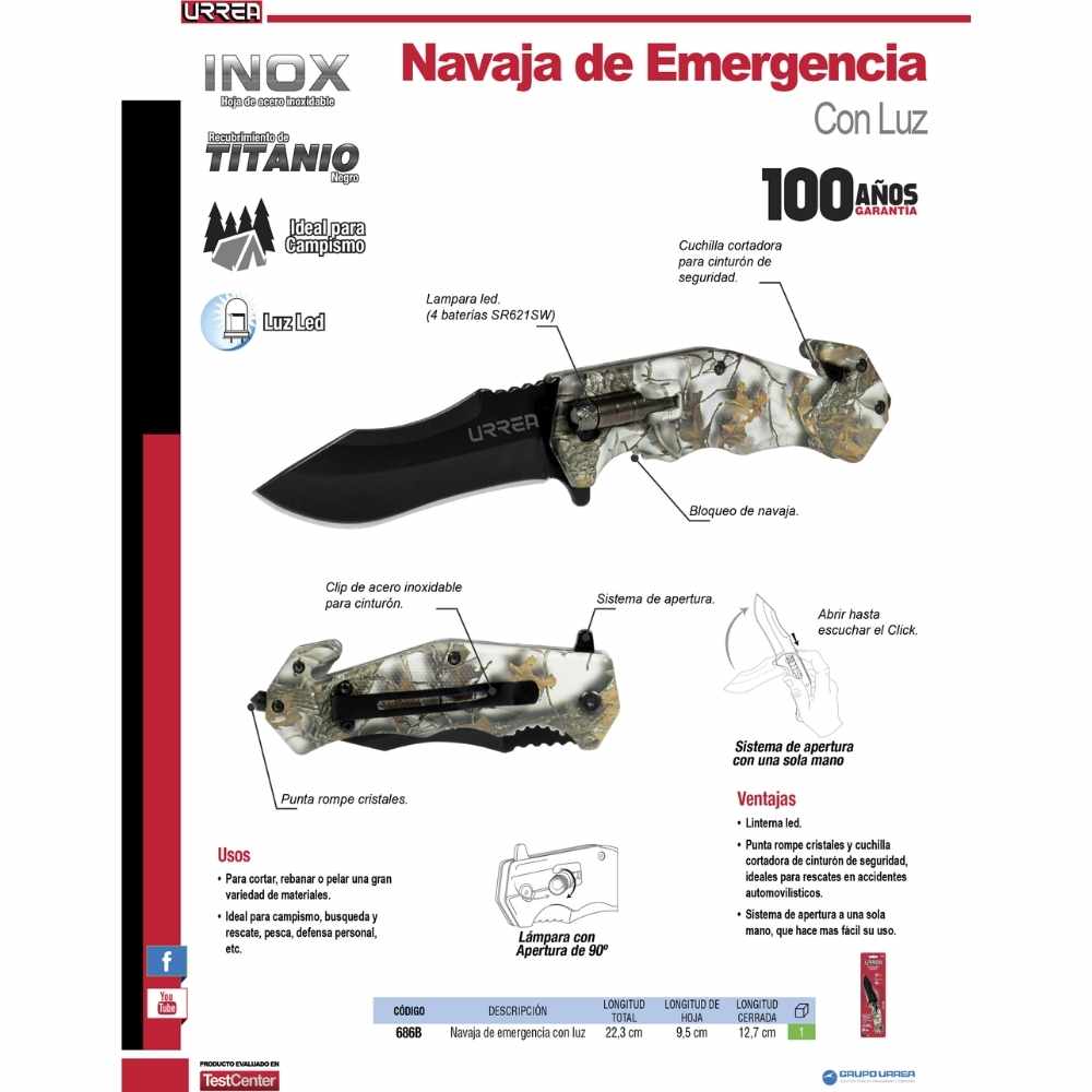 Navaja abatible de acero inoxidable para campamento con luz Urrea