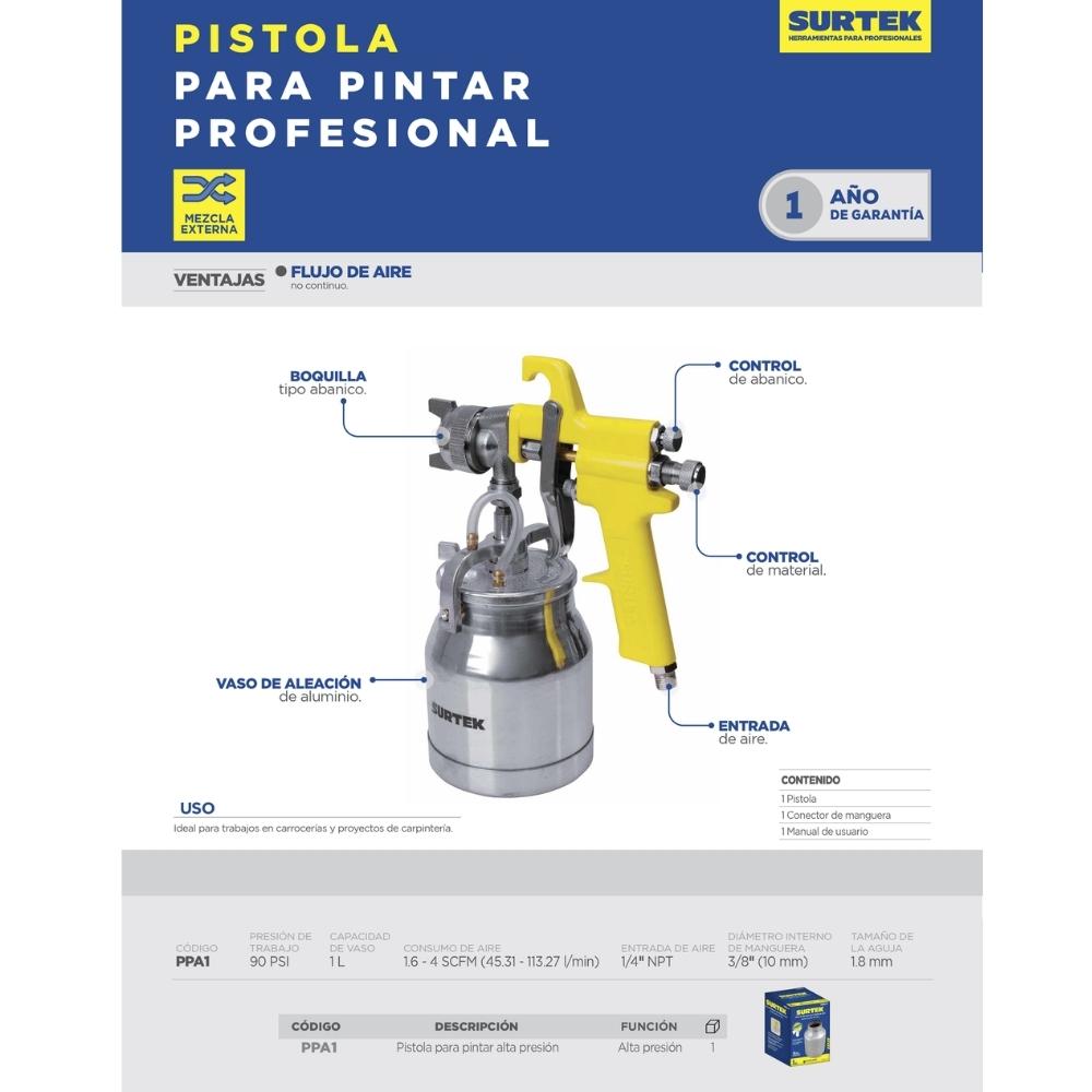 Pistola para pintar con vaso reforzado de alta presión, capacidad 1000 ml, 72 PSI Surtek