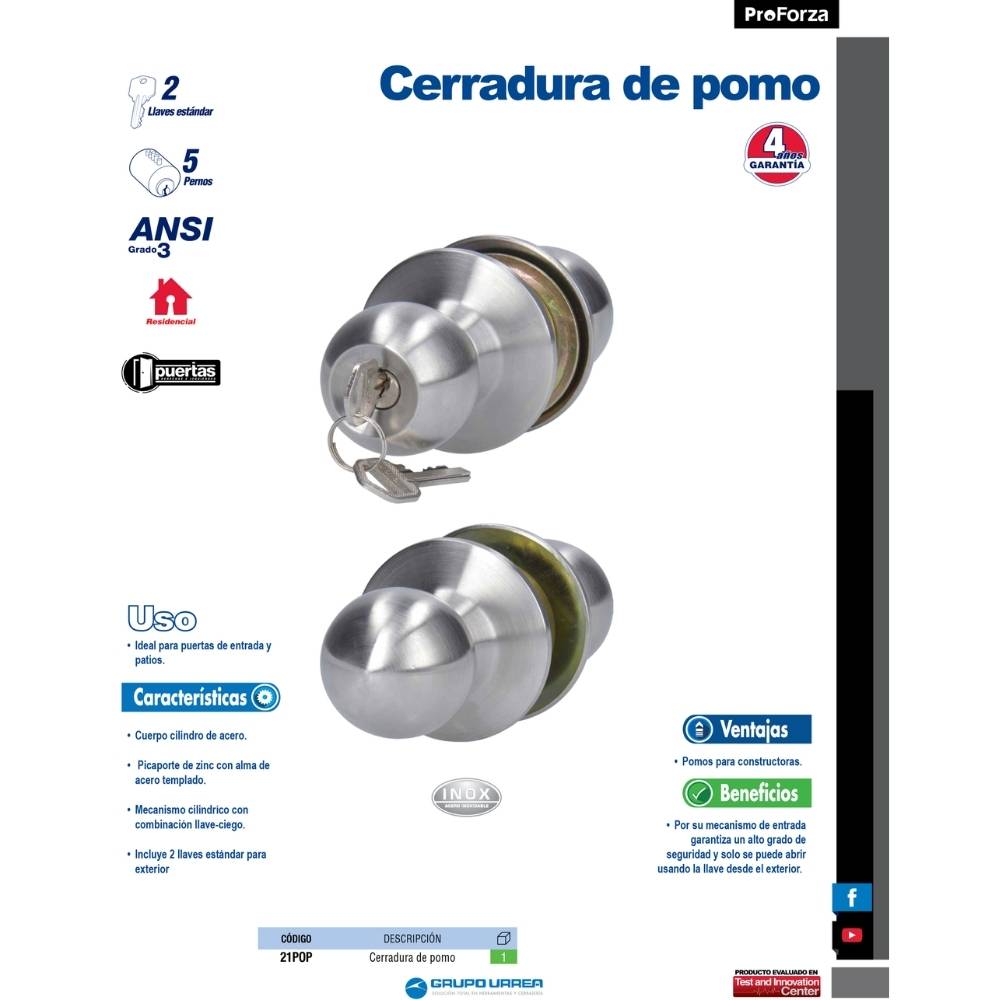 Pomo cilíndrico bola para constructora función entrada, acero inoxidable, llave std, caja Prolok