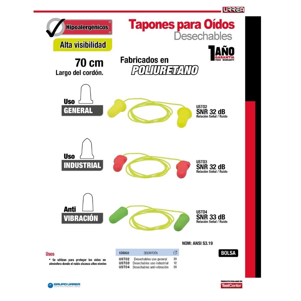 Tapones para oídos desechables de alta visibilidad color verde SNR 32 dB Urrea